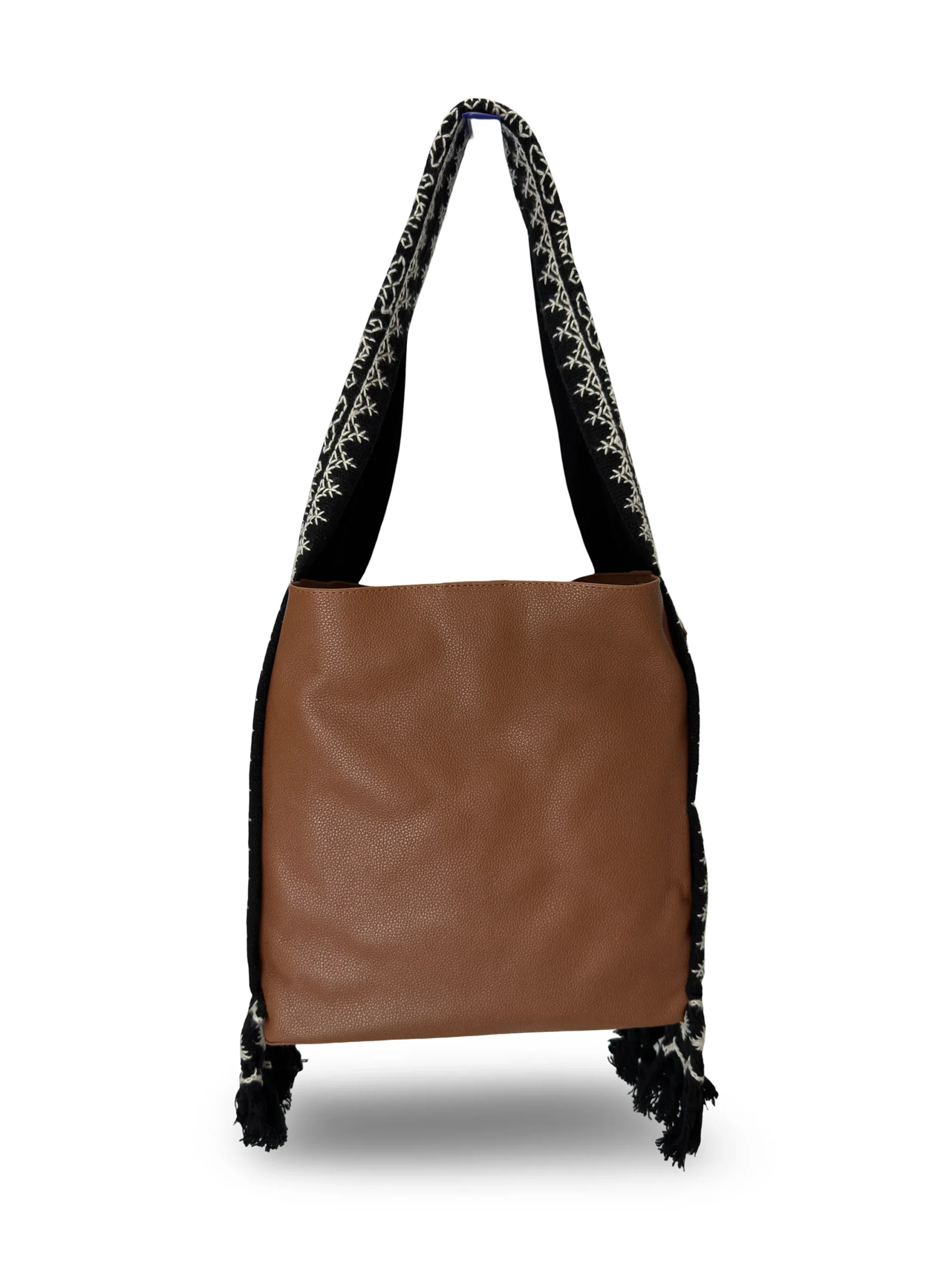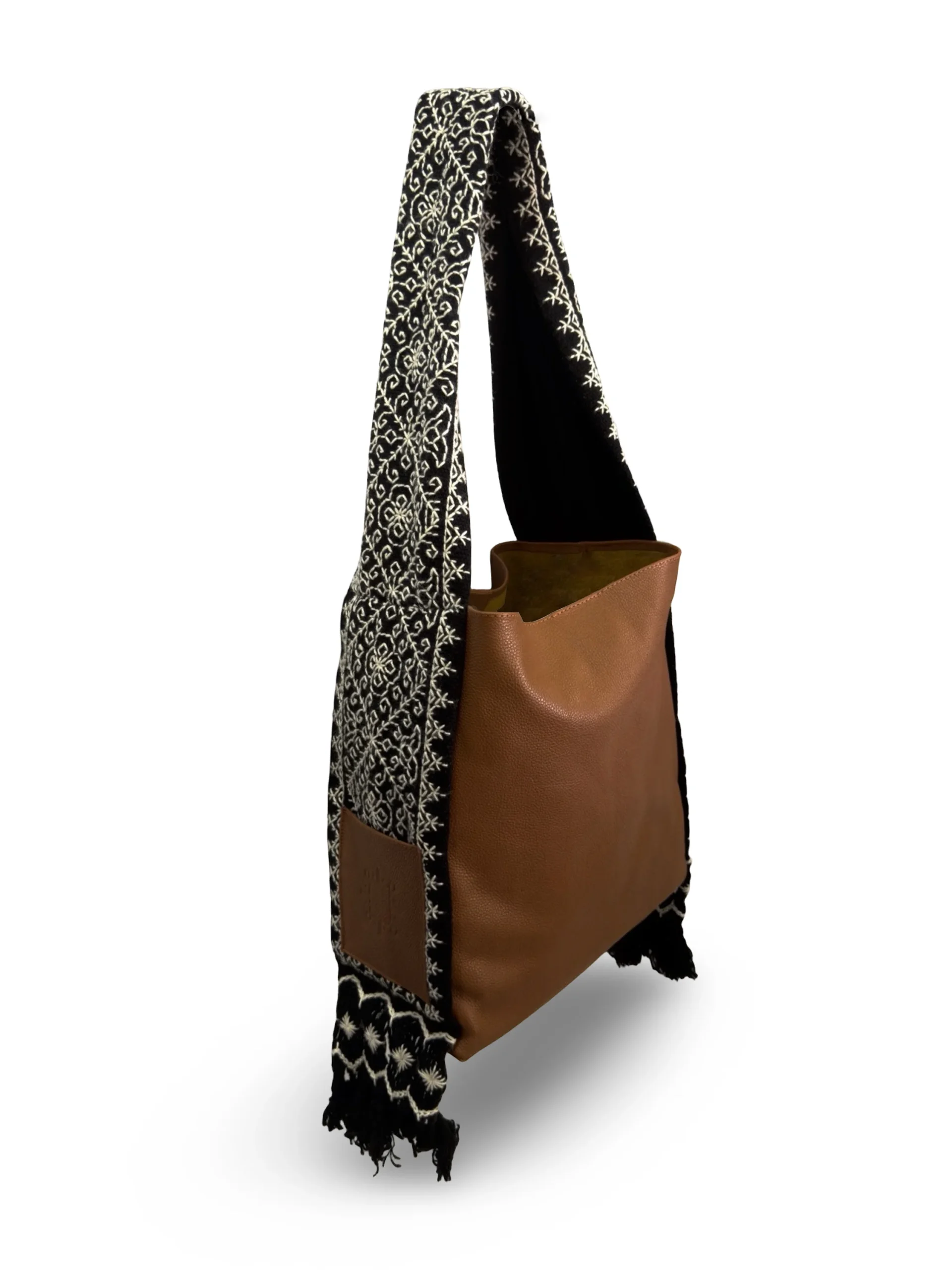 CAMEL, con asa NEGRA de bordado artesanal CRUDO. Dimensiones: 30×34 cm. Un diseño exclusivo, elegante y resistente para