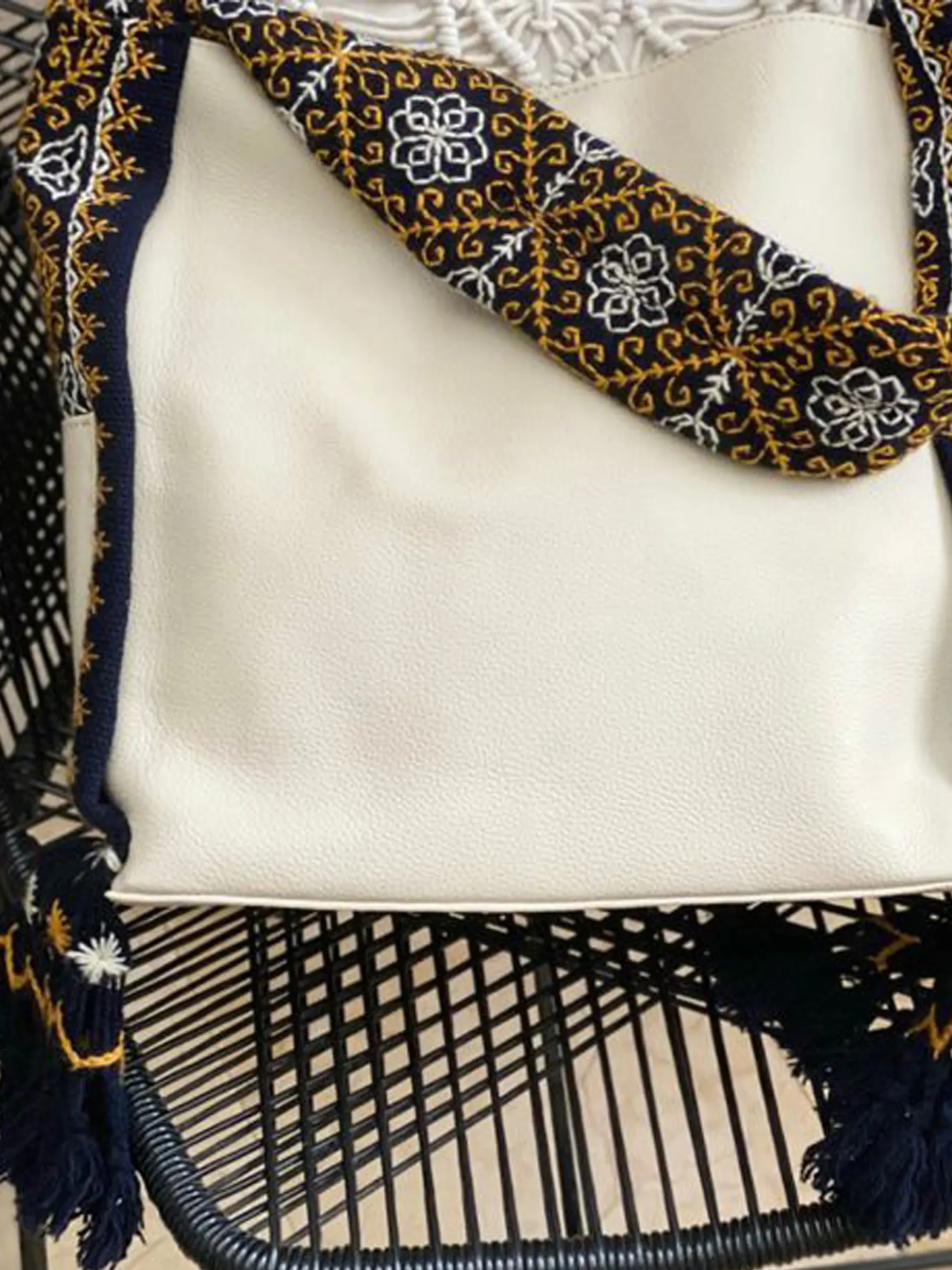 CRUDO, con asa AZUL MARINO de bordado artesanal MOSTAZA Y CRUDO. Dimensiones: 30×34 cm. Un diseño exclusivo, elegante y resistente para