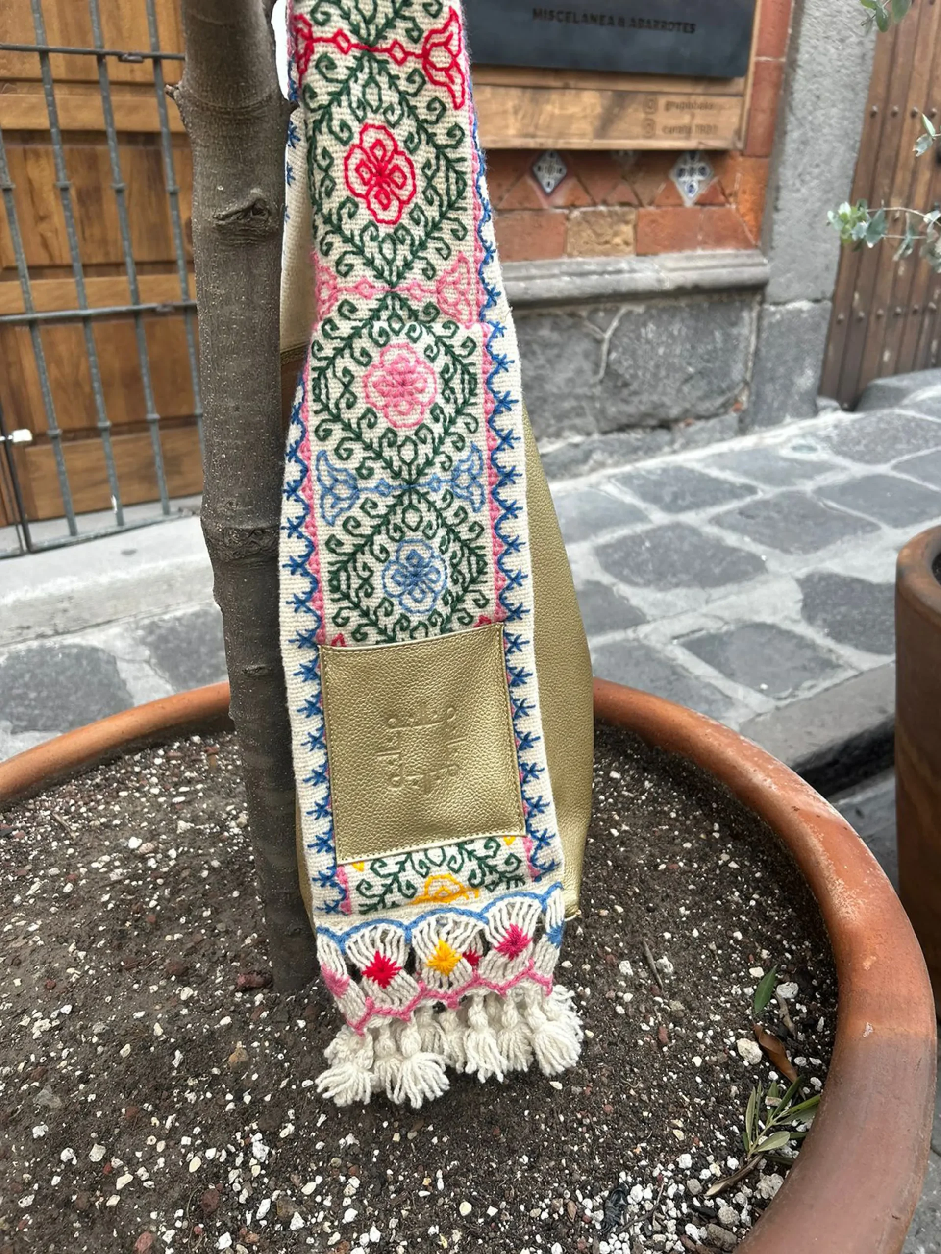 DORADA, con asa CRUDO de bordado artesanal COLORES. Dimensiones: 30×34 cm. Un diseño exclusivo, elegante y resistente para