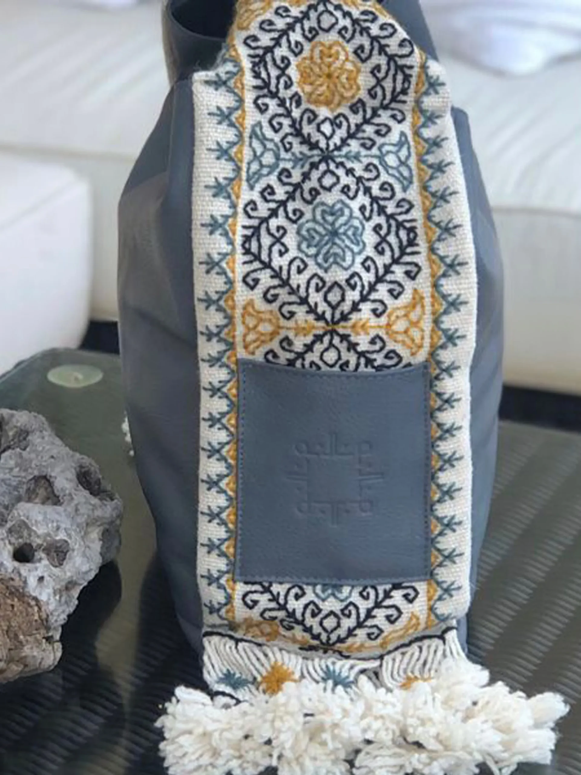 GRIS, con asa CRUDO de bordado artesanal GRIS Y MOSTAZA. Dimensiones: 30×34 cm. Un diseño exclusivo, elegante y resistente para