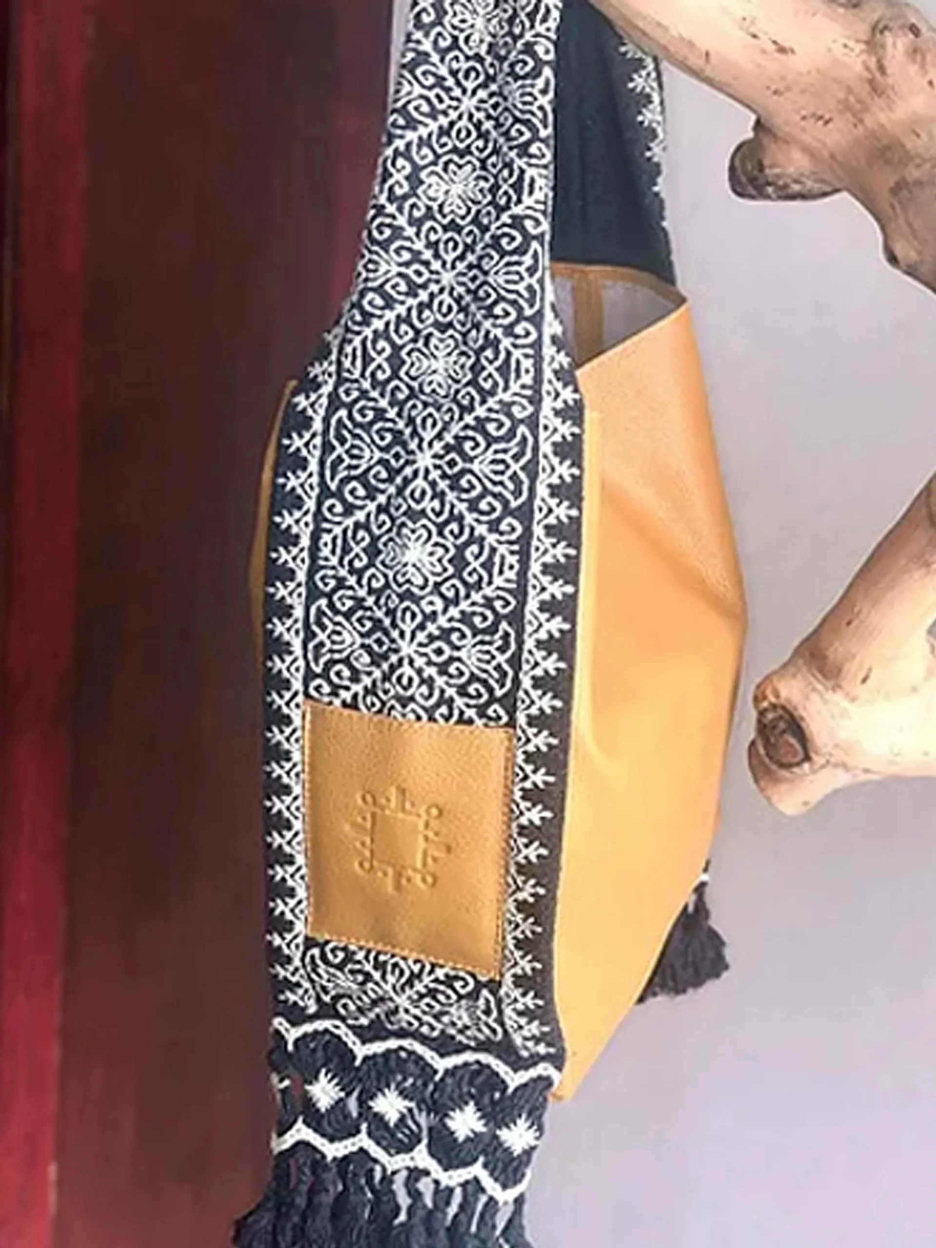 MOSTAZA, con asa GRIS de bordado artesanal CRUDO. Dimensiones: 30×34 cm. Un diseño exclusivo, elegante y resistente para