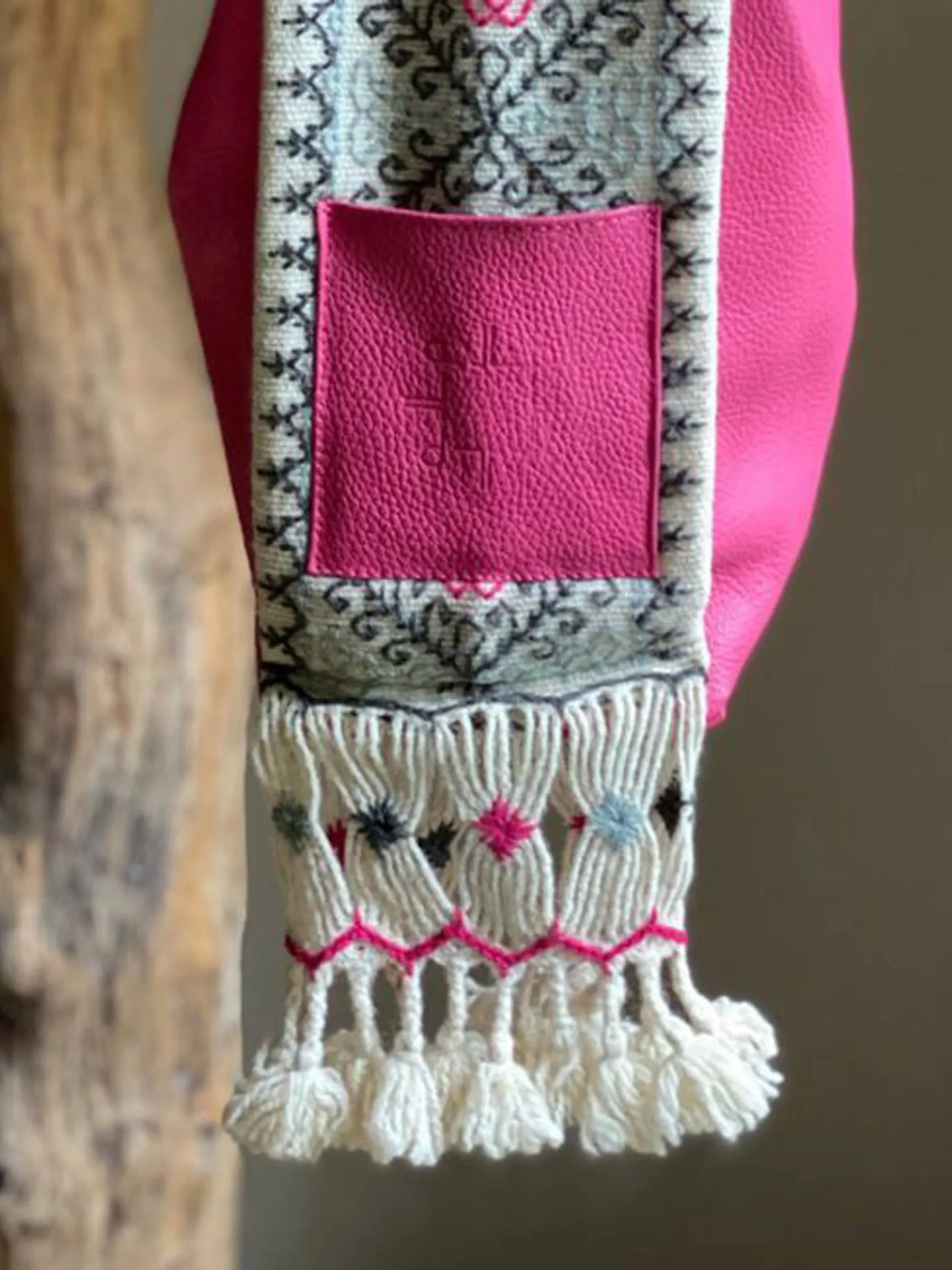 ROSA, con asa CRUDO de bordado artesanal GRIS ROSA Y PLATA. Dimensiones: 30×34 cm. Un diseño exclusivo, elegante y resistente para