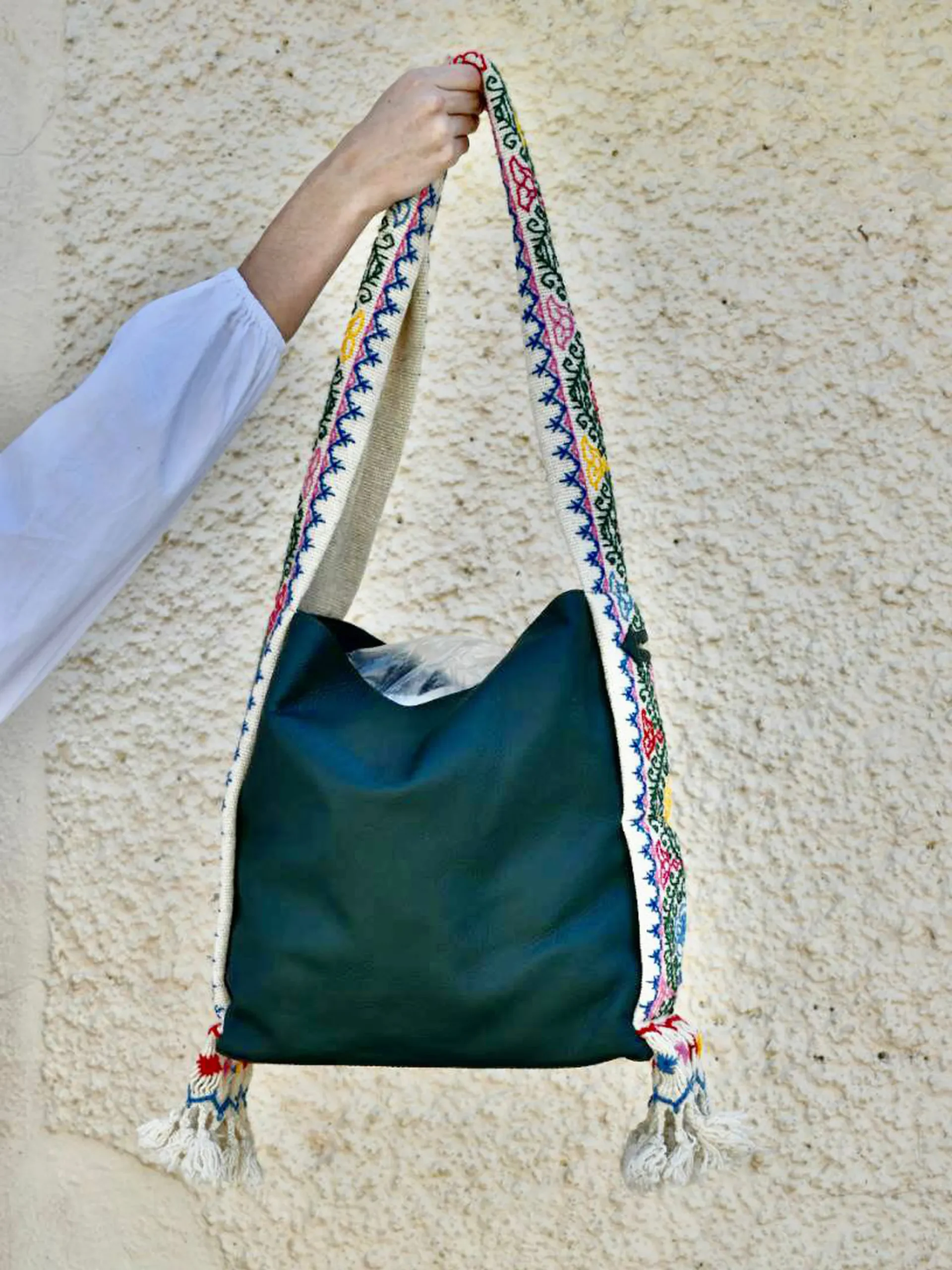 VERDE OLIVO, con asa COLORES de bordado artesanal COLORES. Dimensiones: 30×34 cm. Un diseño exclusivo, elegante y resistente para