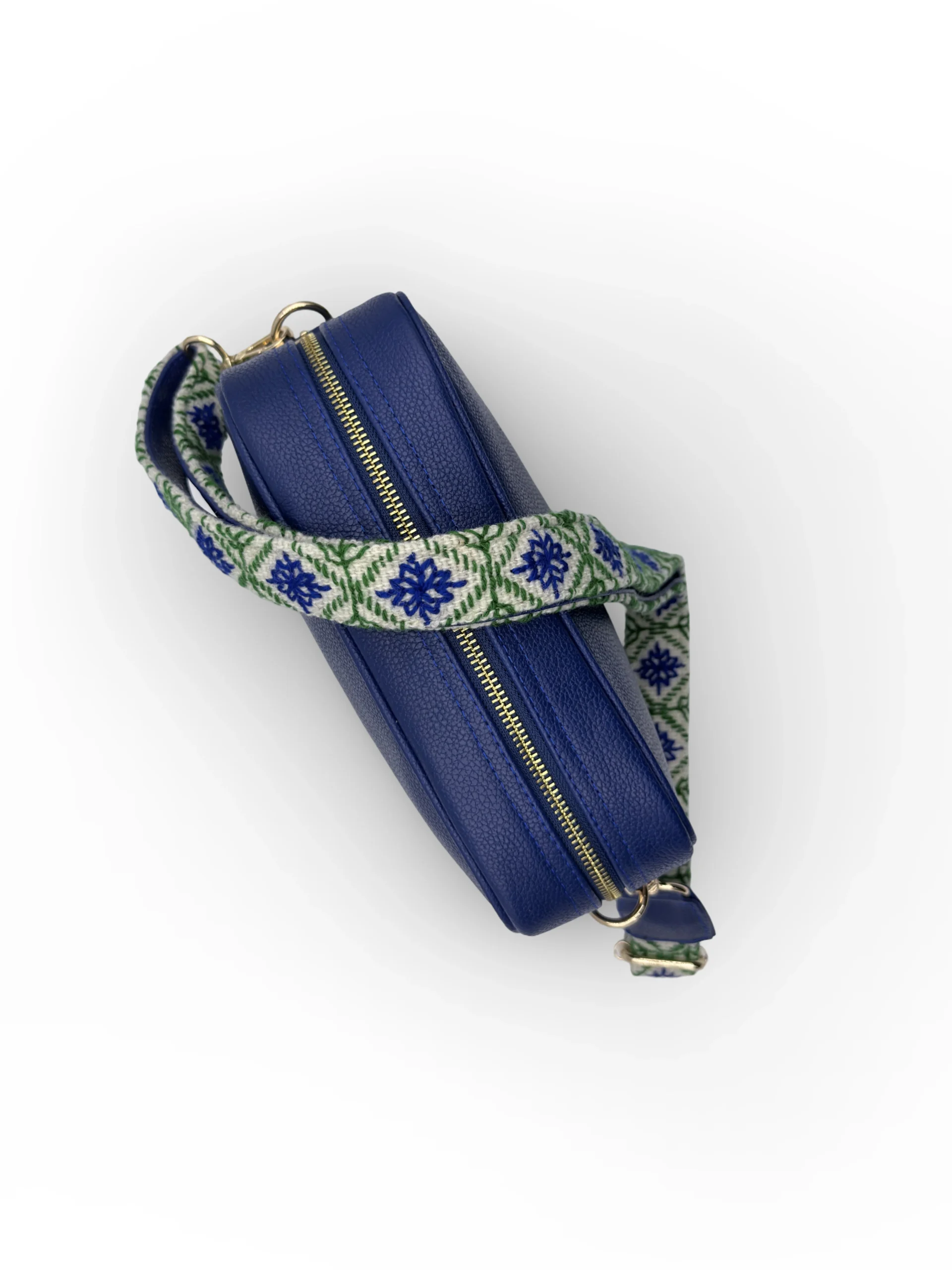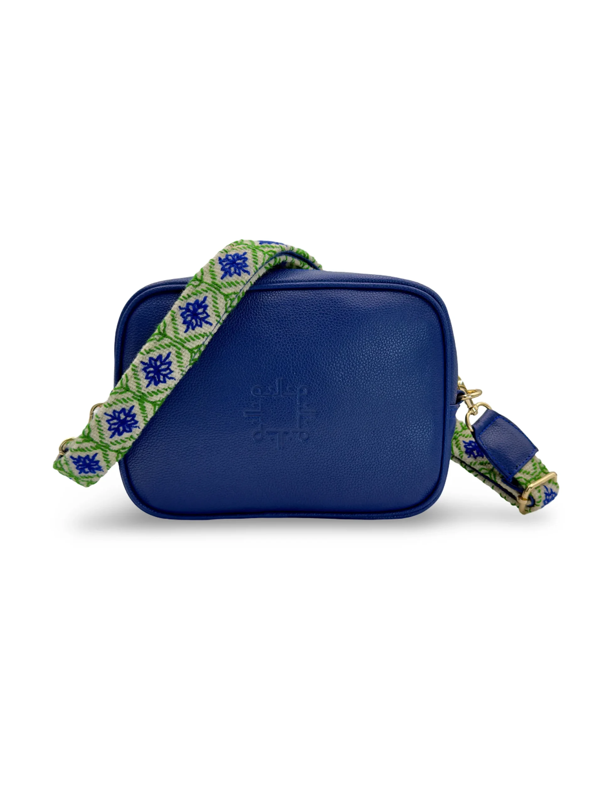 Su asa ajustable, en tono CRUDO, está bordada a mano en colores VERDE Y AZUL, creando un contraste moderno y vibrante que realza la personalidad