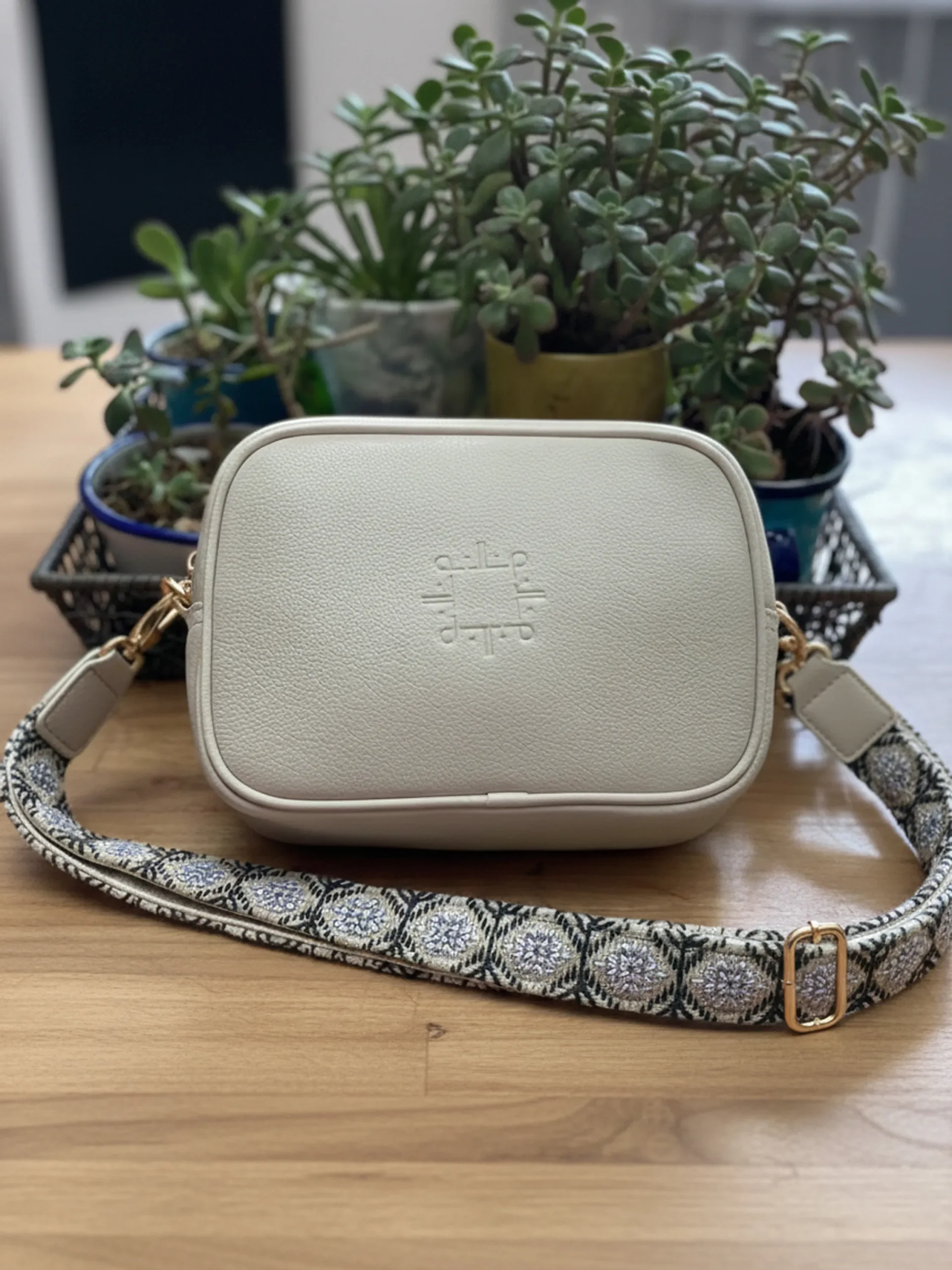 Su asa ajustable, en tono CRUDO, está bordada a mano en colores GRIS Y PLATA, creando un contraste moderno y vibrante que realza la personalidad