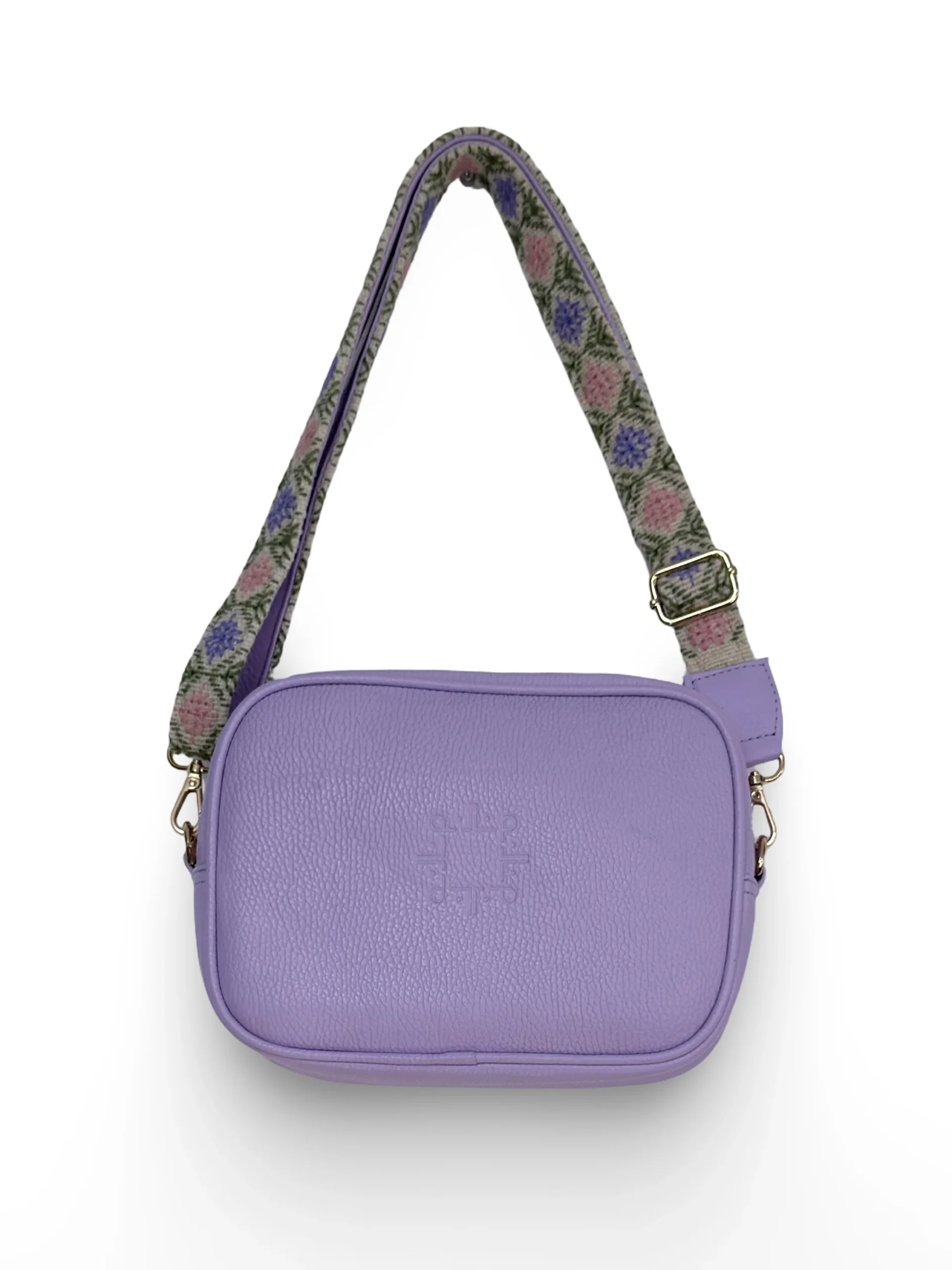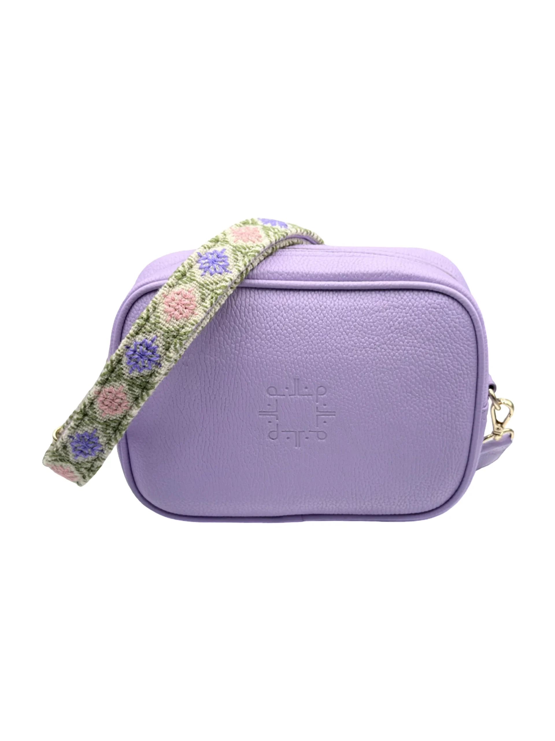 Su asa ajustable, en tono CRUDO, está bordada a mano en colores LILA Y ROSA, creando un contraste moderno y vibrante que realza la personalidad