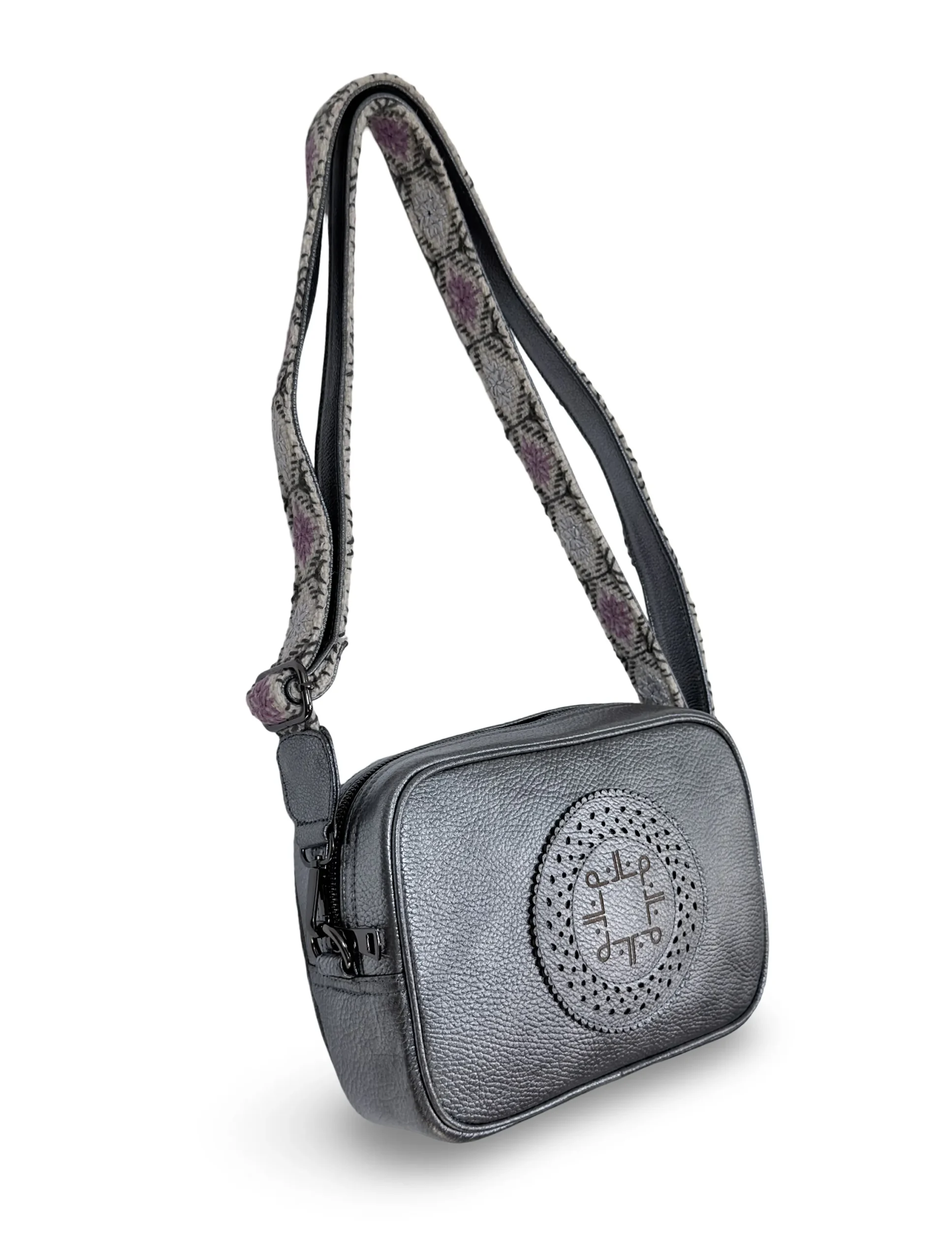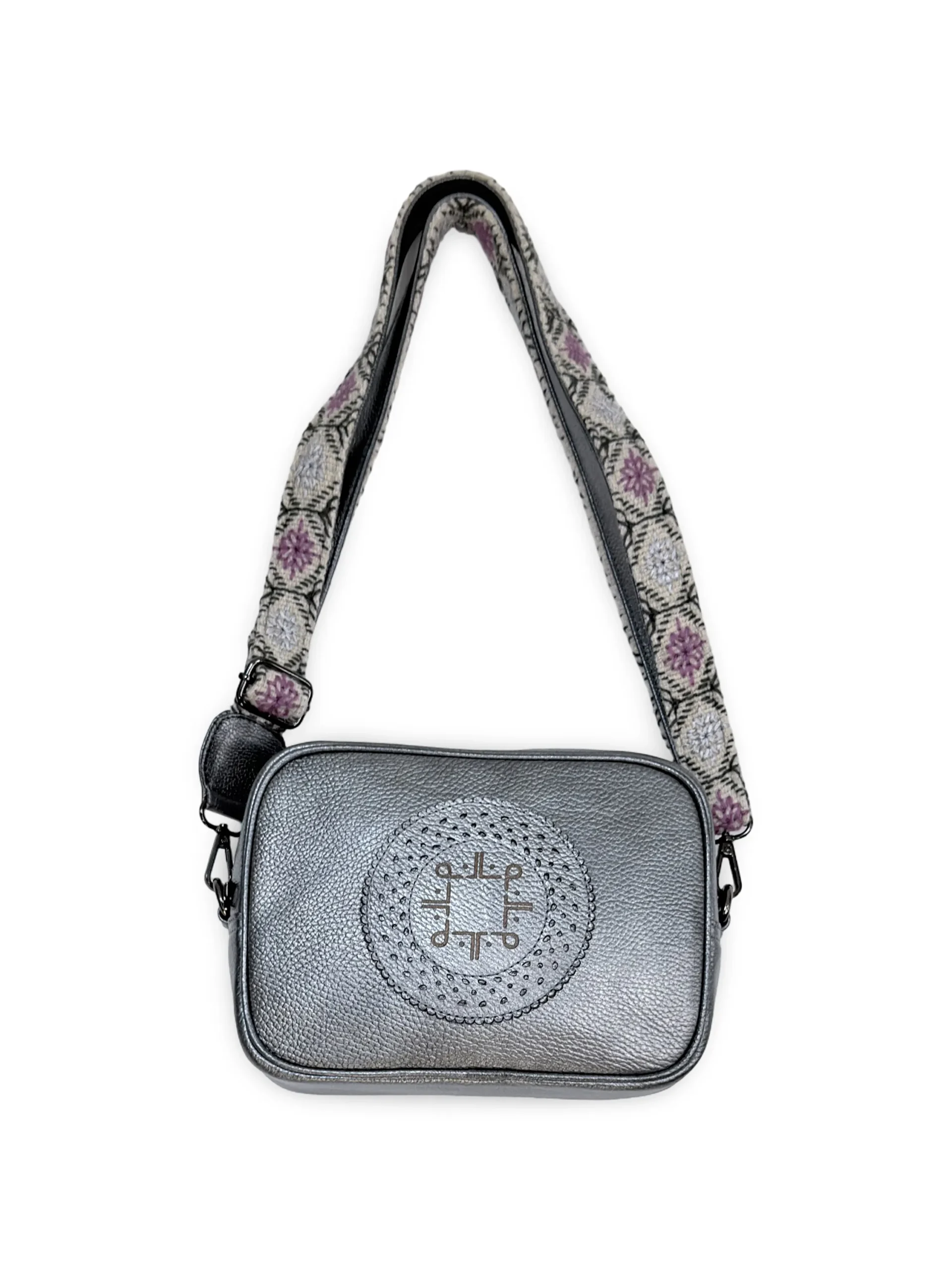Su asa ajustable, en tono CRUDO, está bordada a mano en colores GRIS Y PLATA, creando un contraste moderno y vibrante que realza la personalidad