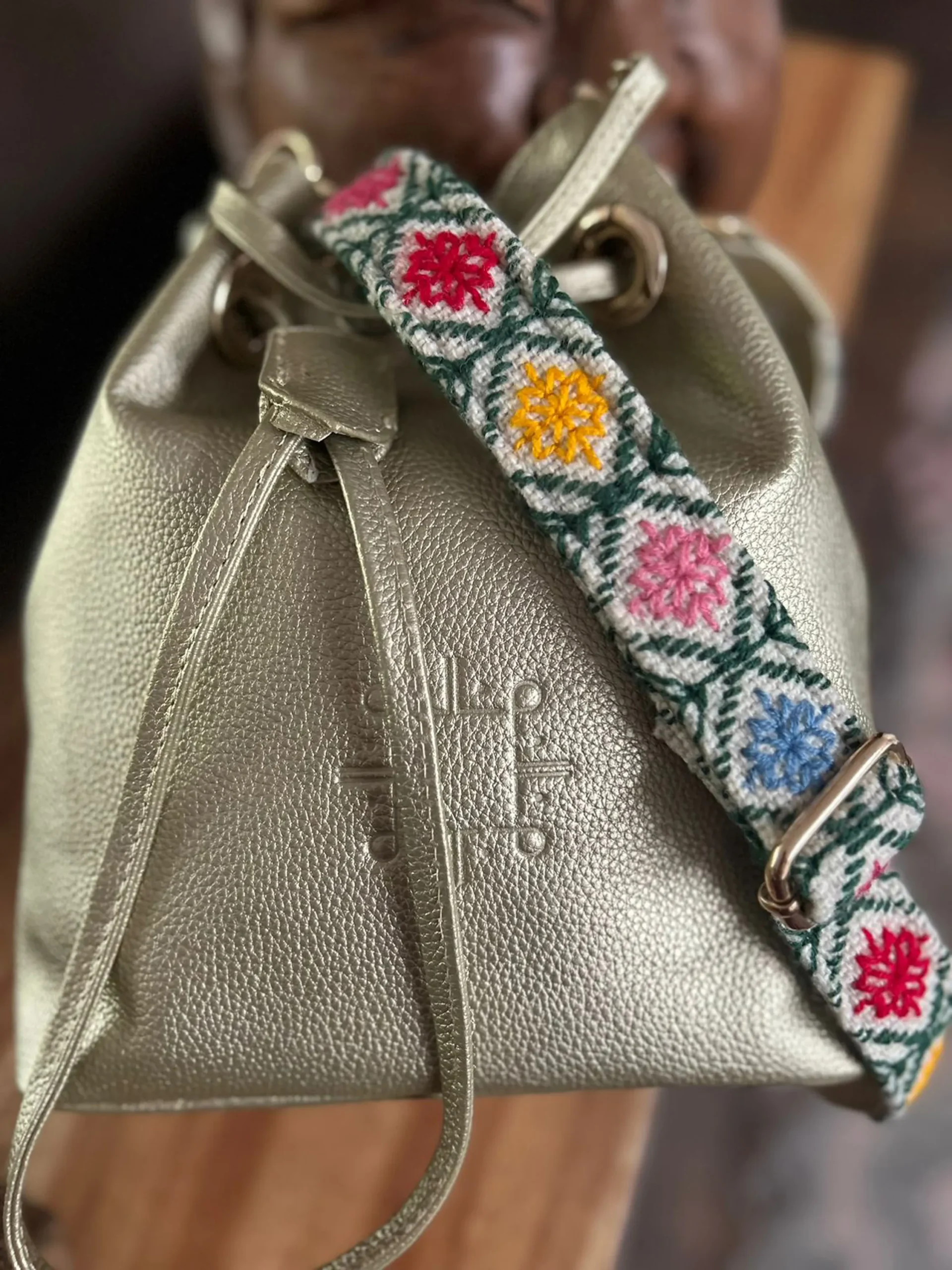 Su asa ajustable en color CRUDO, bordada a mano en tono DORADA, añade un contraste sofisticado y único. Cada bordado es realizado con