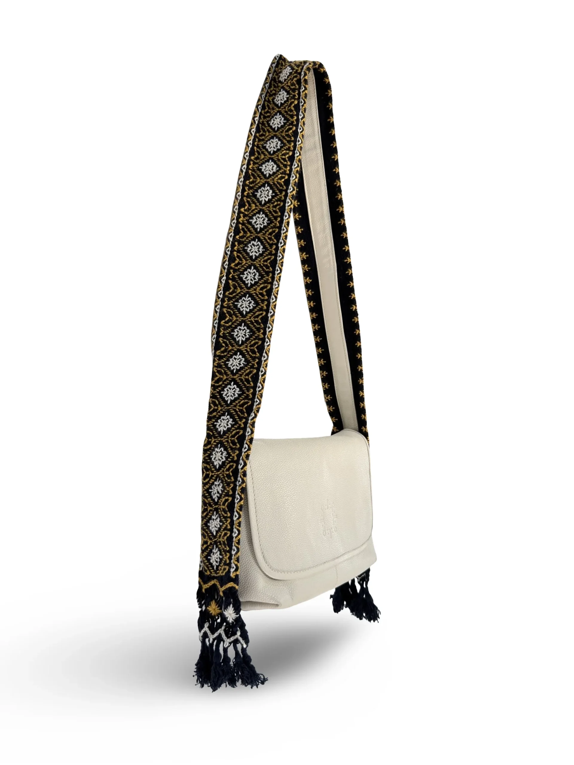 incorpora un asa larga de 1.43 m + 10 cm de amarre por cada lado, en tono AZUL MARINO, decorada con un bordado artesanal en color MOSTAZA Y CRUDO, que