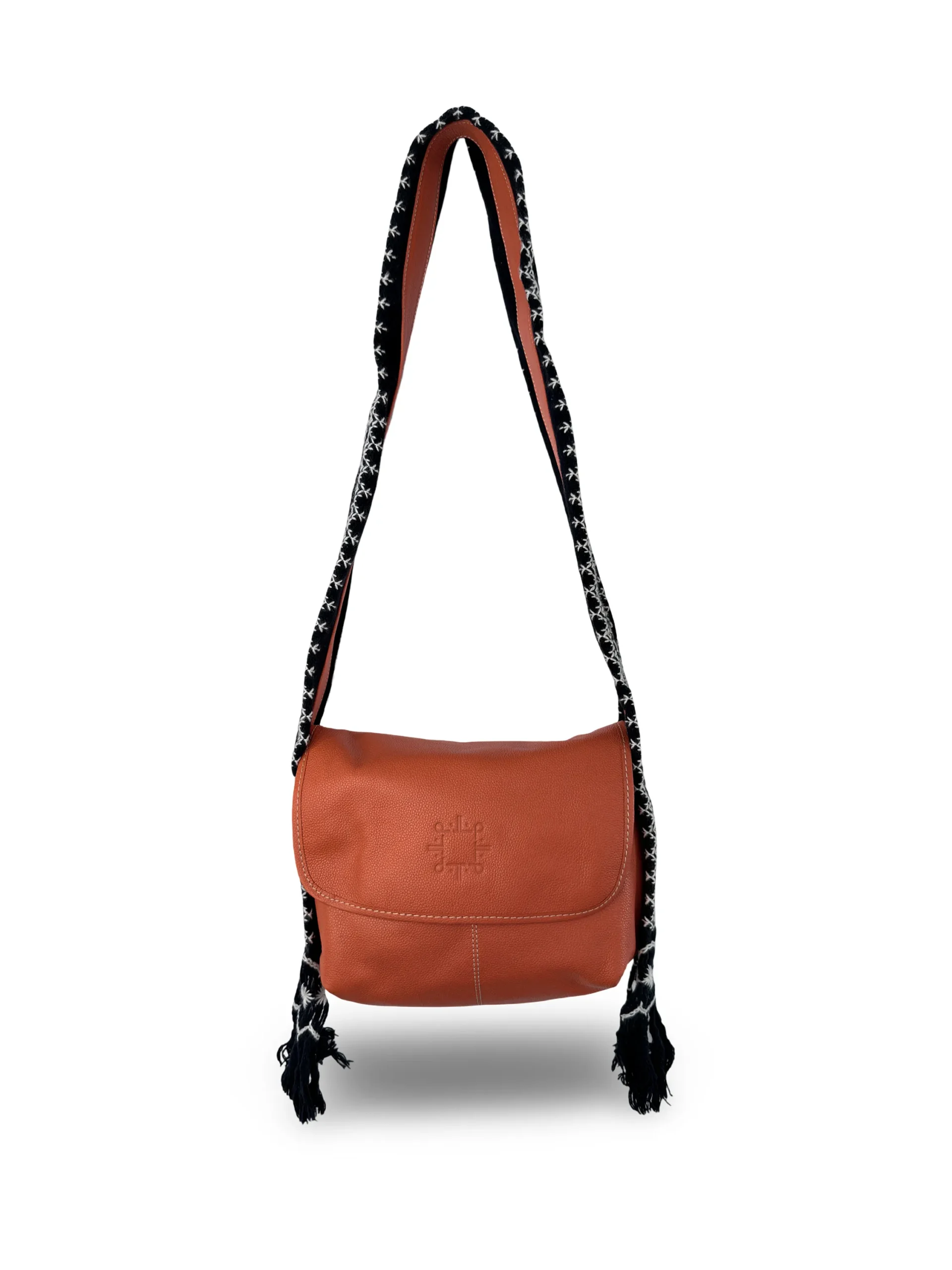 incorpora un asa larga de 1.43 m + 10 cm de amarre por cada lado, en tono AZUL MARINO, decorada con un bordado artesanal en color CRUDO, que