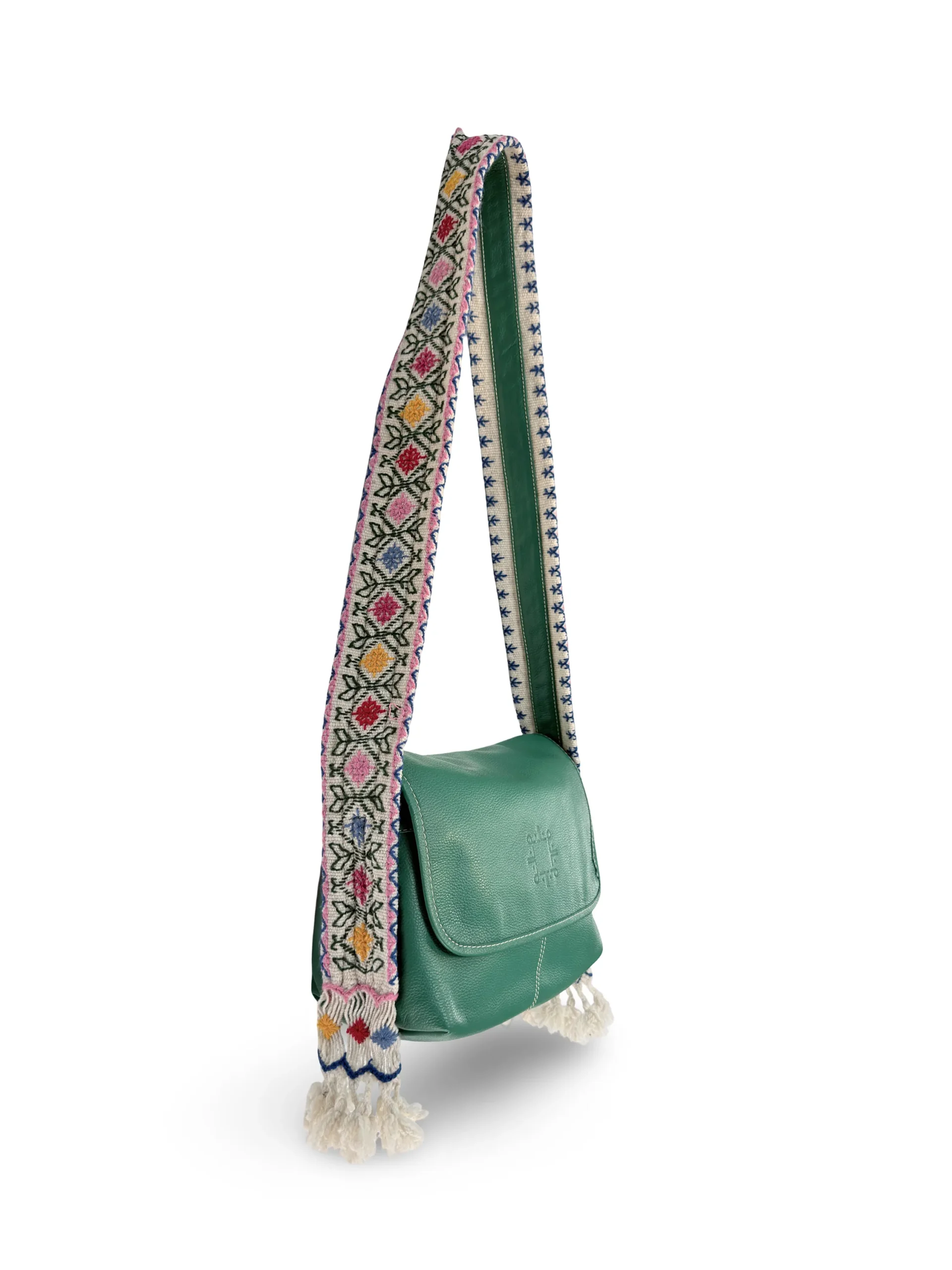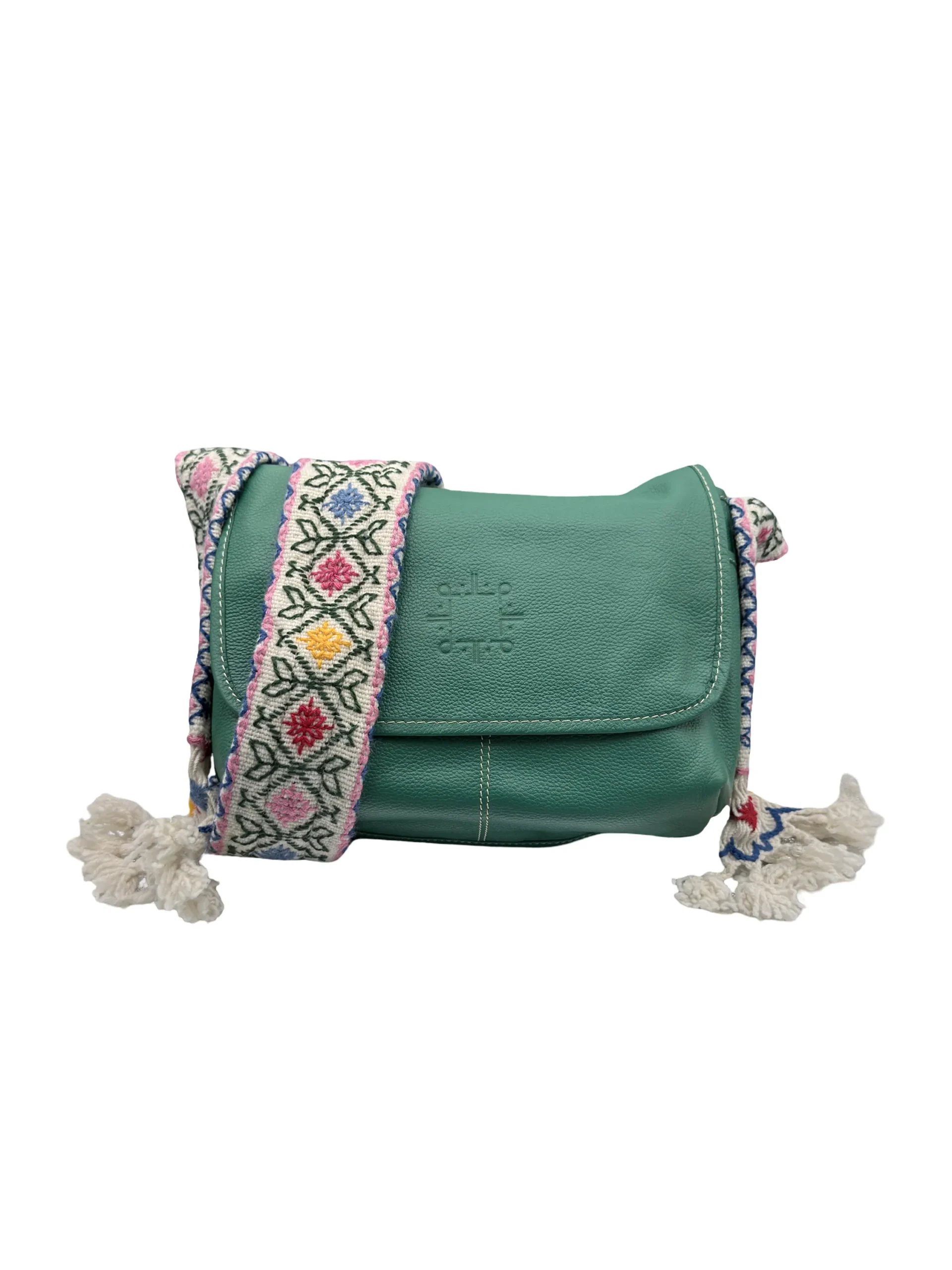 incorpora un asa larga de 1.43 m + 10 cm de amarre por cada lado, en tono CRUDO, decorada con un bordado artesanal en color COLORES, que
